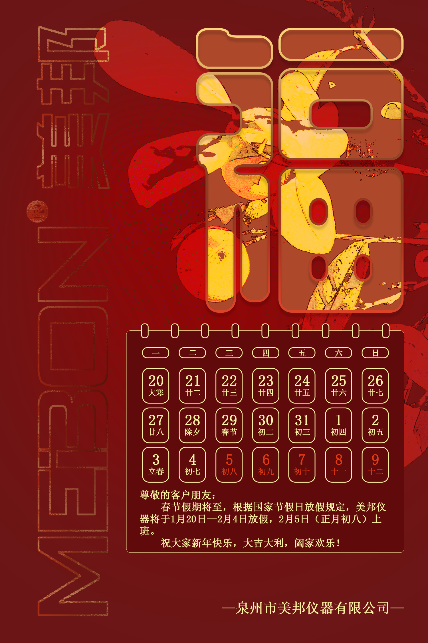 春節(jié)假期將至,根據(jù)國(guó)家節(jié)假日放假規(guī)定,美邦儀器將于1月20日—2月4日放假,2月5日(正月初八)上班。