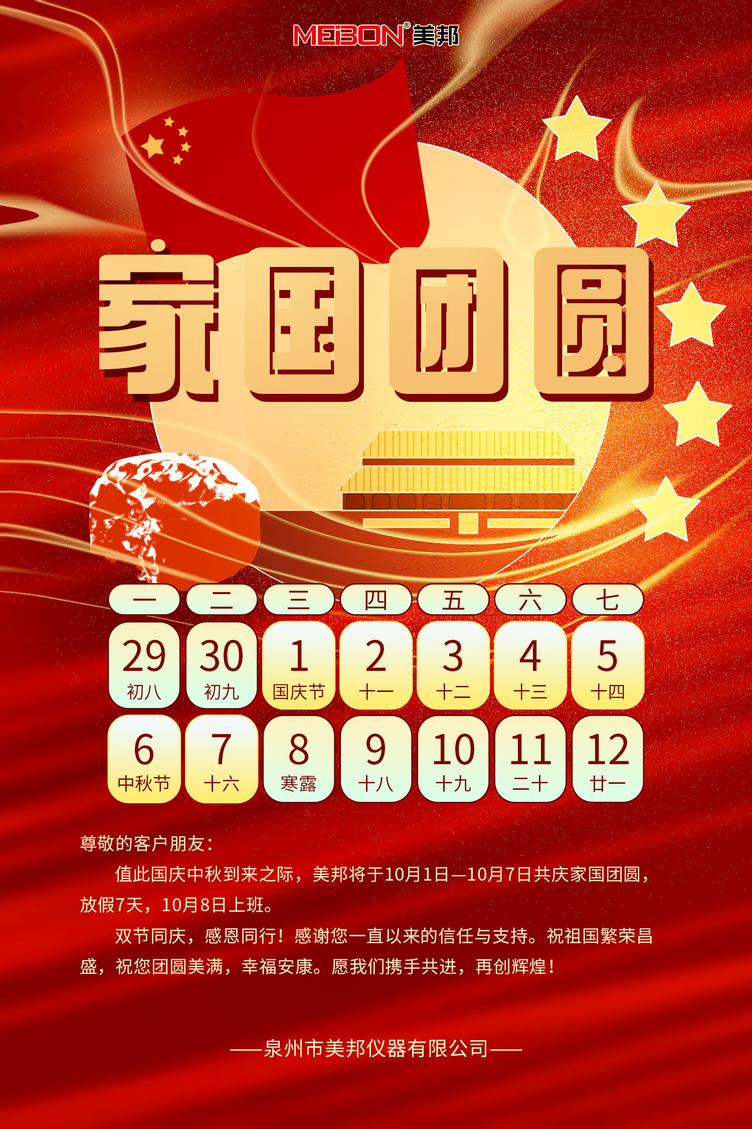 雙節(jié)同慶,感恩同行!感謝您一直以來的信任與支持。祝祖國繁榮昌盛,祝您團(tuán)圓美滿,幸福安康。愿我們攜手共進(jìn),再創(chuàng)輝煌!